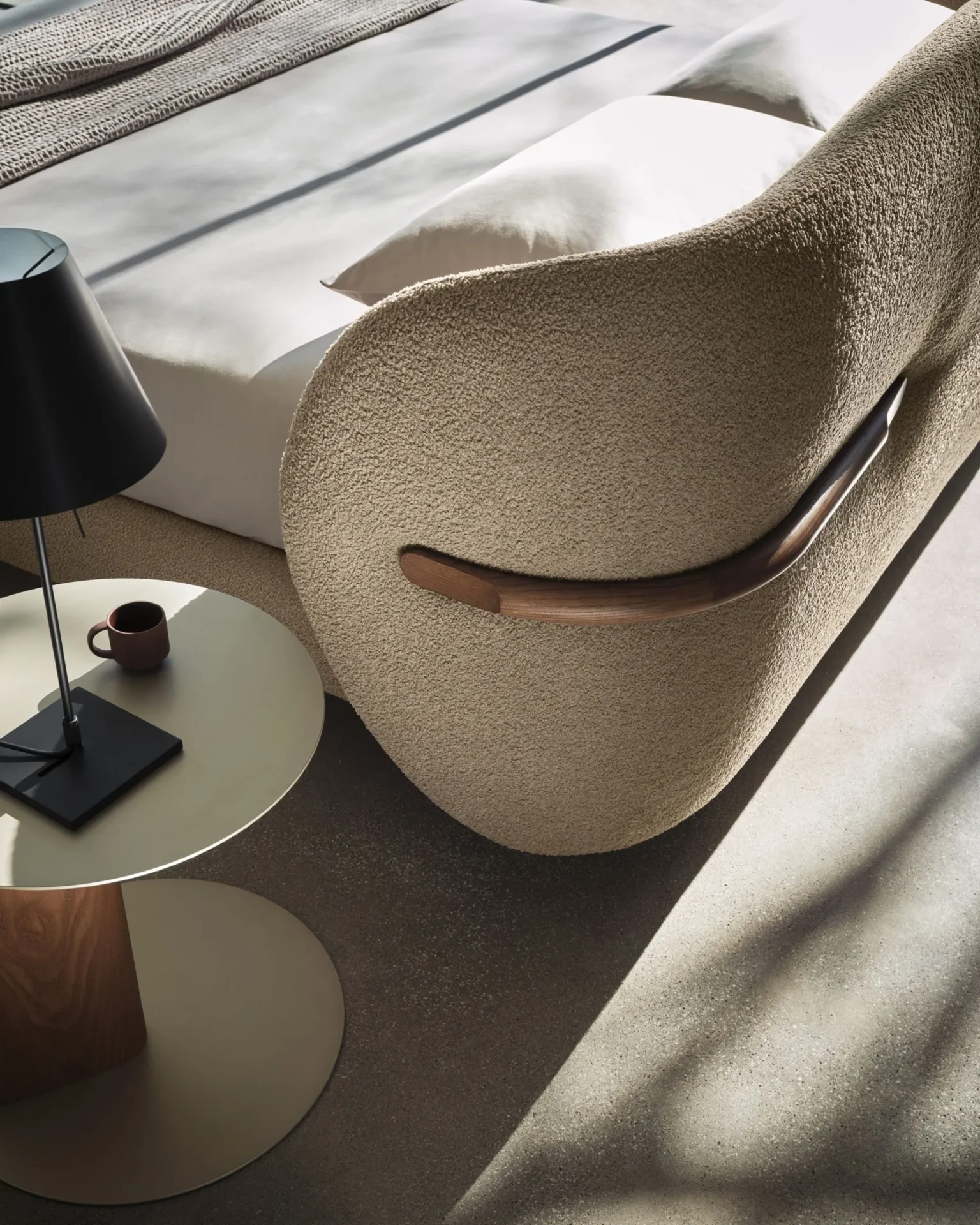 Wyjątkową cechą łóżka Oleandro jest jego otulający zagłówek, którego poziomy element „obejmuje” tapicerkę delikatnie podkreślając jej miękkość. Konstrukcja dostępna jest w wersji drewnianej lub metalowej, spójnie dopasowanej do nóg, co nadaje całości wyrafinowany, bardzo elegancki charakter. Dzięki swojej formie łóżko zostało zaprojektowane również z myślą o ustawieniu w centralnej części sypialni, gdzie w pełni wybrzmiewa jego rzeźbiarska forma.