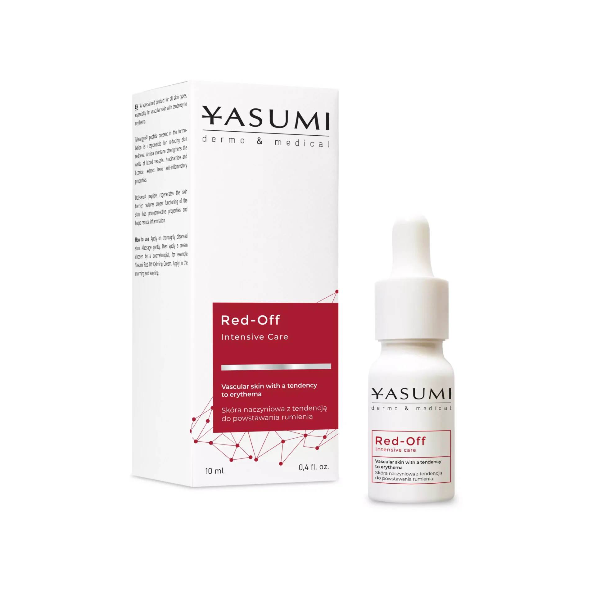 Yasumi Red off Intensive Care – bogate serum redukujące zaczerwienienia. Zawiera tetrapeptyd Teleangyn®, niacynamid oraz arnikę górską, które obkurczają oraz uszczelniają naczynia krwionośne, redukują rumień. Ekstrakt z korzenia lukrecji działa przeciwzapalnie, przeciwobrzękowo i nawilżająco, łagodzi podrażnienia. Wspomaga regenerację i gojenie ran. Dodatkowo przyspiesza wchłanianie mikrowylewów podskórnych oraz siniaków. Wyrównuje koloryt skóry. Serum przy cerze suchej warto stosować rano i wieczorem, przy cerze tłustej – wieczorem.