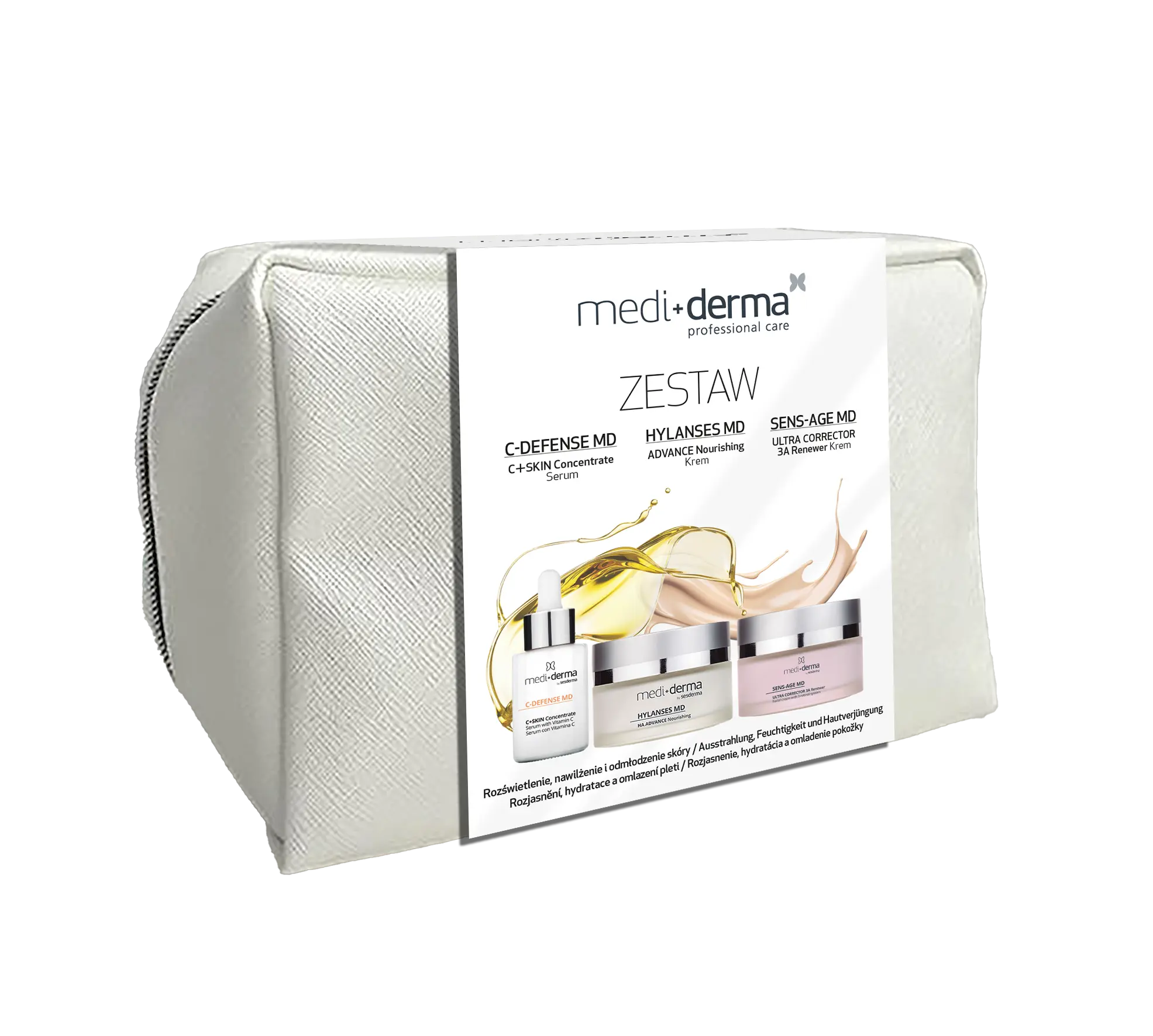 Złota kosmetyczka została stworzona z myślą o rozświetleniu i energii. Zawiera liposomowe serum C-DEFENSE MD C+SKIN Concentrate (30 ml) z witaminą C w stabilnej formie, zamkniętej w nanosomach, które rozjaśnia skórę, koryguje oznaki zmęczenia i działa przeciwstarzeniowo, jednocześnie wzmacniając naturalne mechanizmy obronne. Drugim produktem jest C-DEFENSE MD C+SKIN Bright Fluid (50 ml) — lekki krem-żel z witaminą C, peptydami i naturalnymi wyciągami rozjaśniającymi, poprawiający elastyczność, wyrównujący koloryt i dodający skórze blasku.